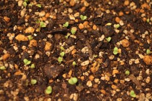 そこらじゅうに、まだ開ききっていないバジルの双葉が見えますね。